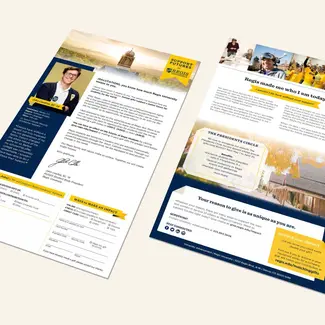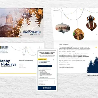 Regis University contracted with my previous employer for support in their campus fundraising efforts. I designed collateral based on the packages they picked, which included print, emails, and the occasional branded gift item.
